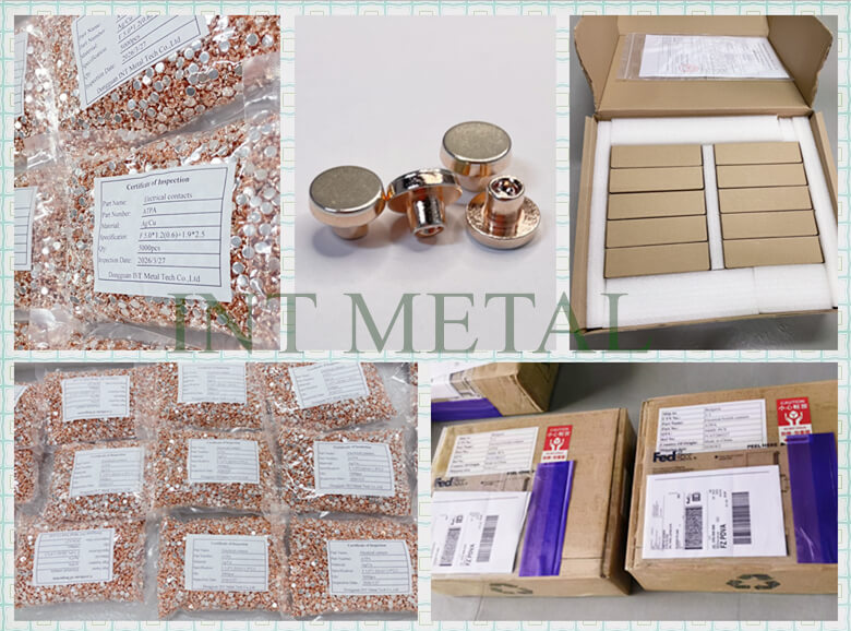 டோங்குவான் இன்ட் மெட்டல் டெக் கோ லிமிடெட்குளிர் அழுத்த கலவை (குளிர் தலைப்பு) செயல்முறையை ஏற்றுக்கொள்கிறது, இது மிகப்பெரிய அழுத்தத்தின் மூலம் திட நிலையில் வெள்ளி அல்லது வெள்ளி கலவையை தாமிரத்துடன் இணைக்கிறது. இந்த செயல்முறை வெள்ளி அடுக்கின் சீரான தடிமன் மற்றும் மிக அதிக பிணைப்பு வலிமையை உறுதி செய்கிறது வெள்ளி தொடர்புகள்தயாரித்ததுINT உலோகம்வாடிக்கையாளர் தயாரிப்புகளின் வாழ்நாள் நம்பகத்தன்மைக்கு உத்தரவாதம் அளிக்க முடியும்.